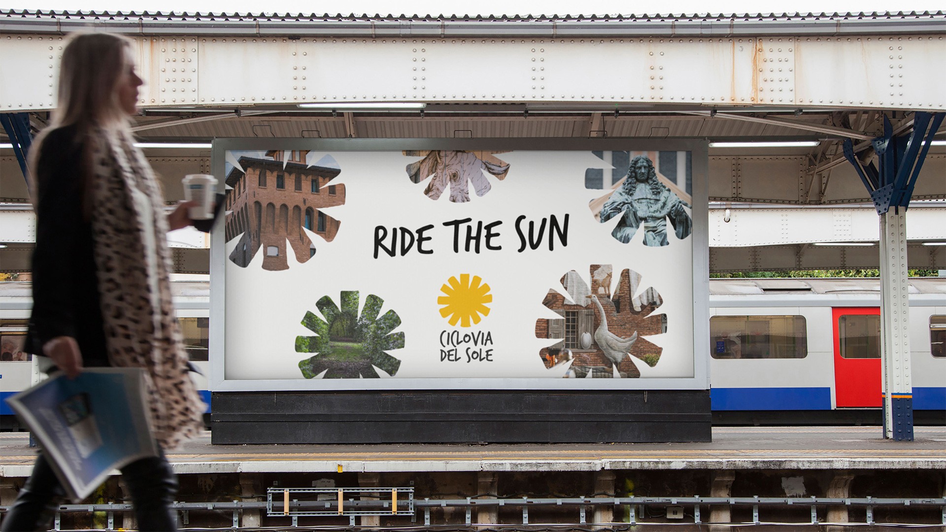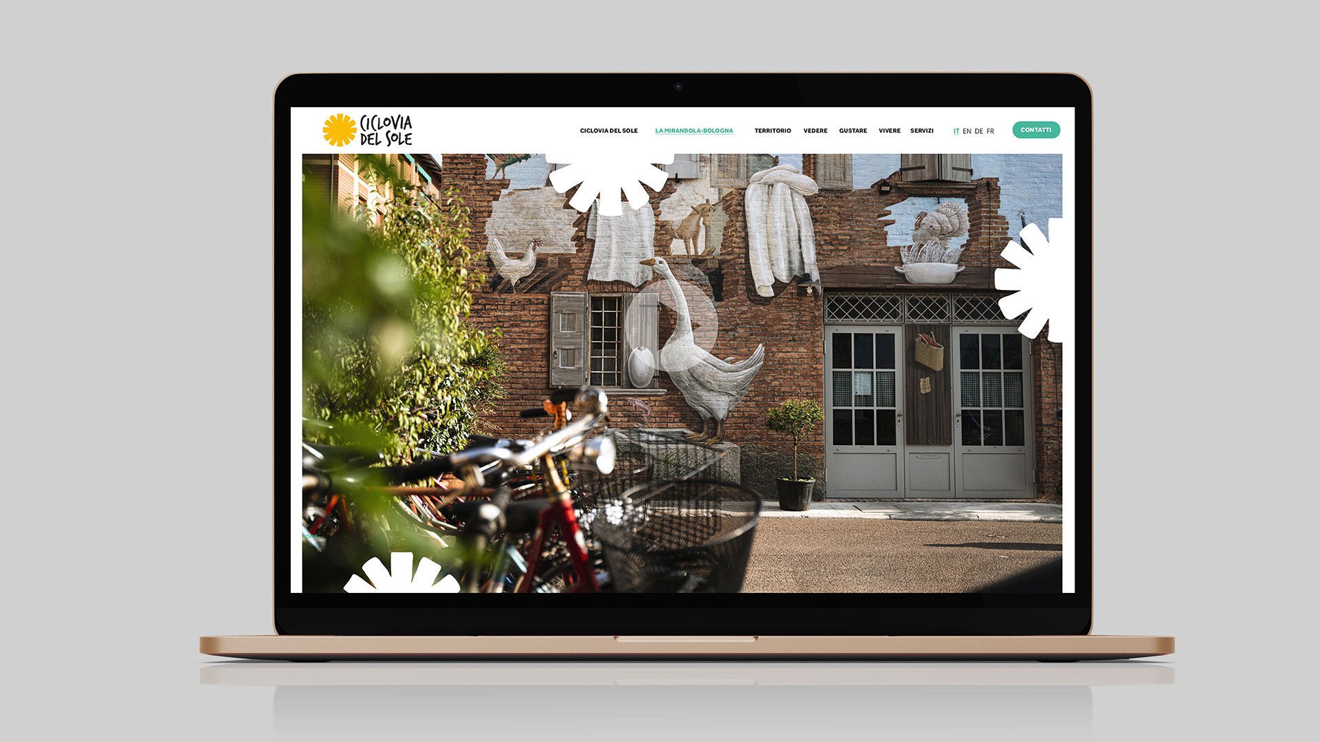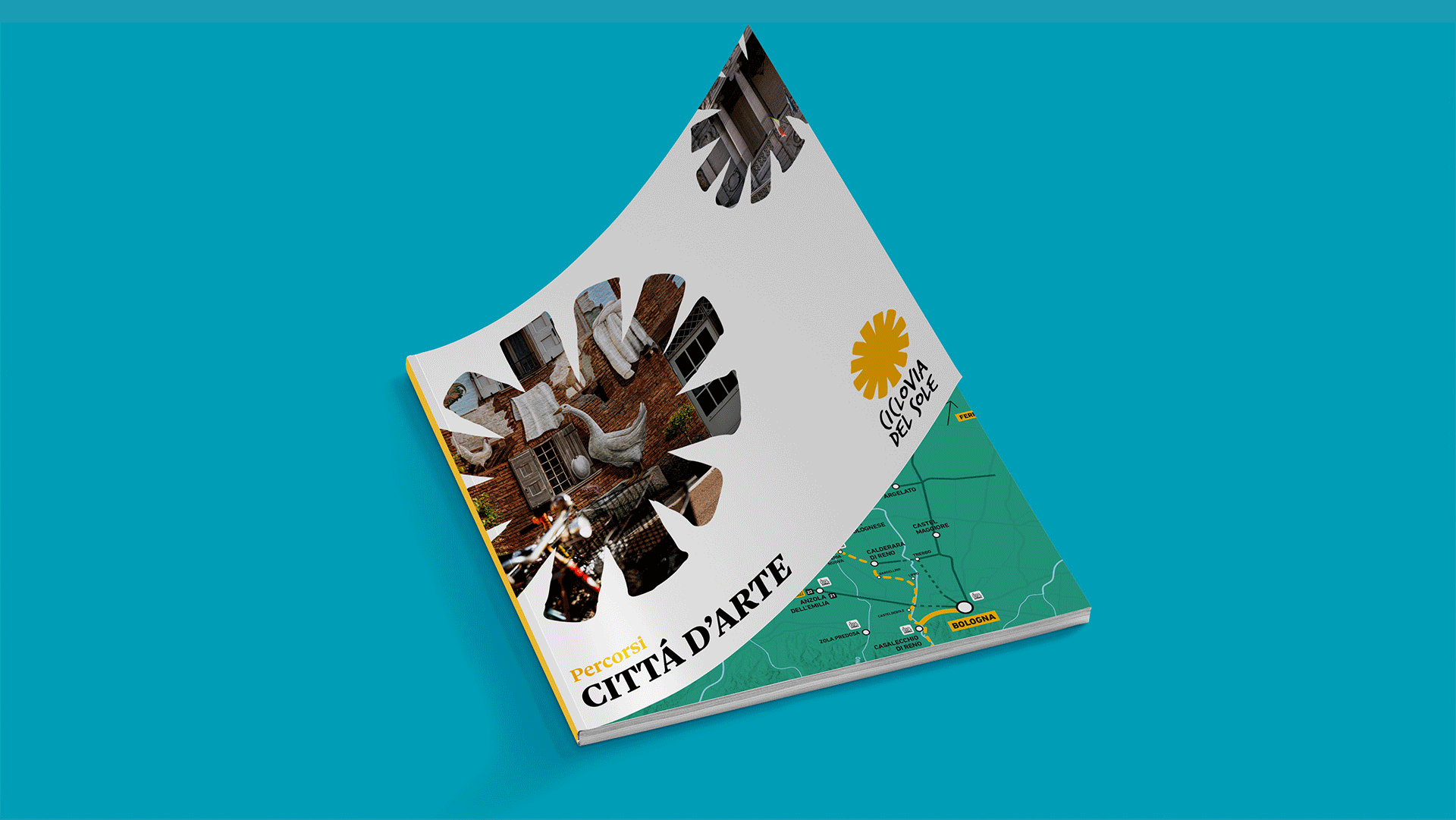 Come si comuncia un territorio ad ampio raggio? attraverso un segno che orienta, unisce, accompagna. Lo abbiamo messo su totem, pannelli, magliette, sito. I ciclisti non possono sbagliare strada >> Follow the sun.